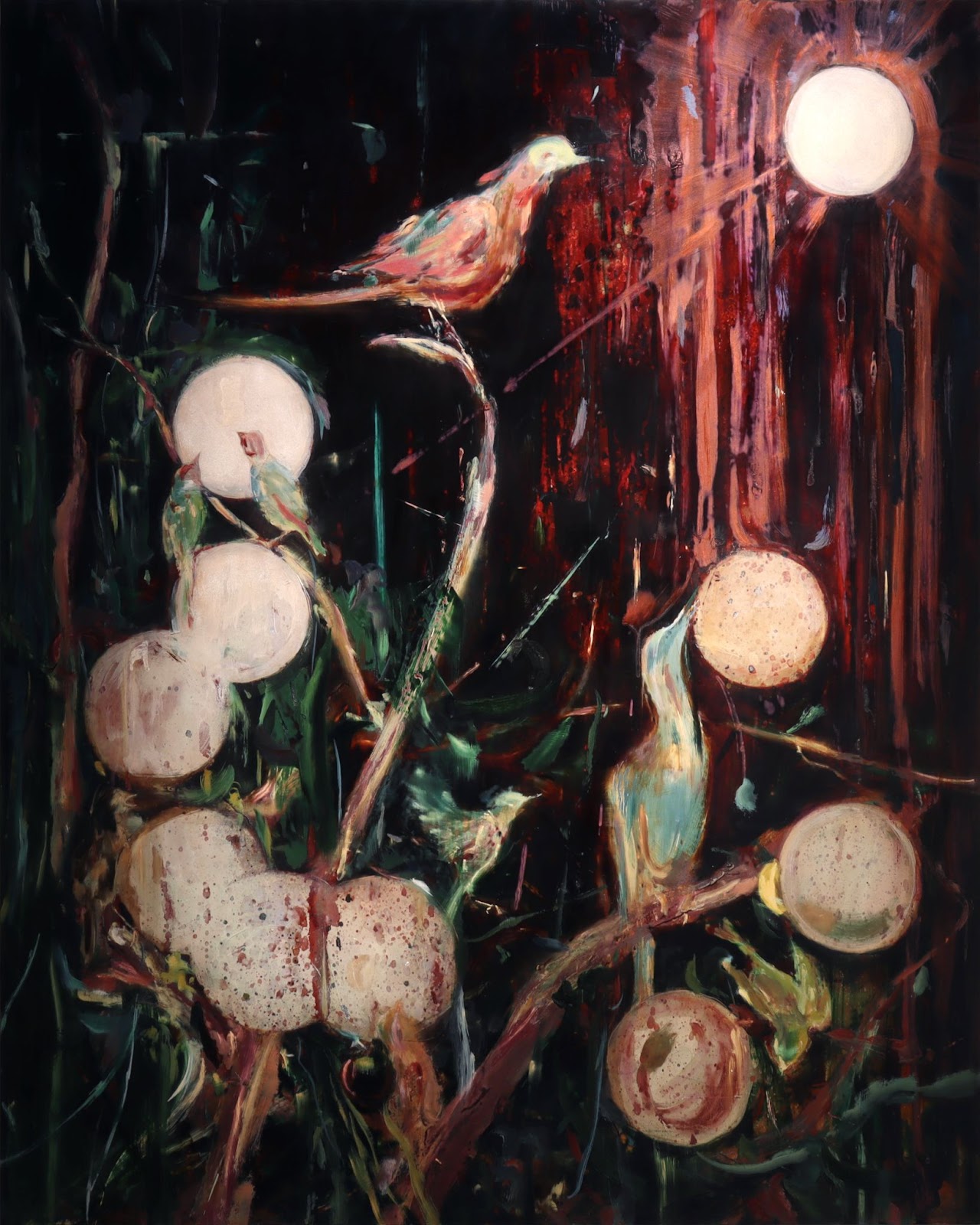 神聖な力が宿るとされる餅と、太陽と、鳥は、それぞれが相互に交わりながら複雑に絡まり合う世界観を編み上げています。