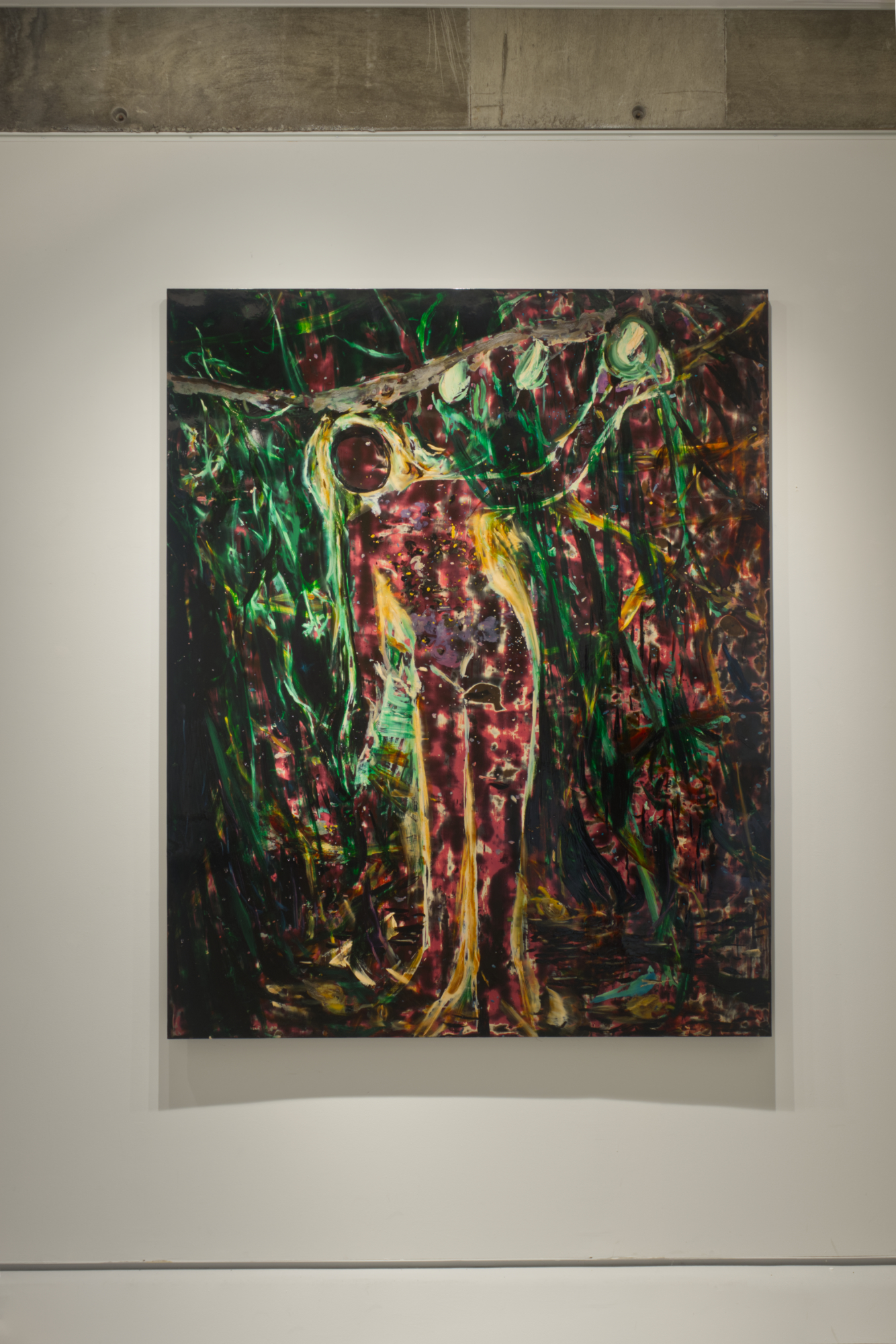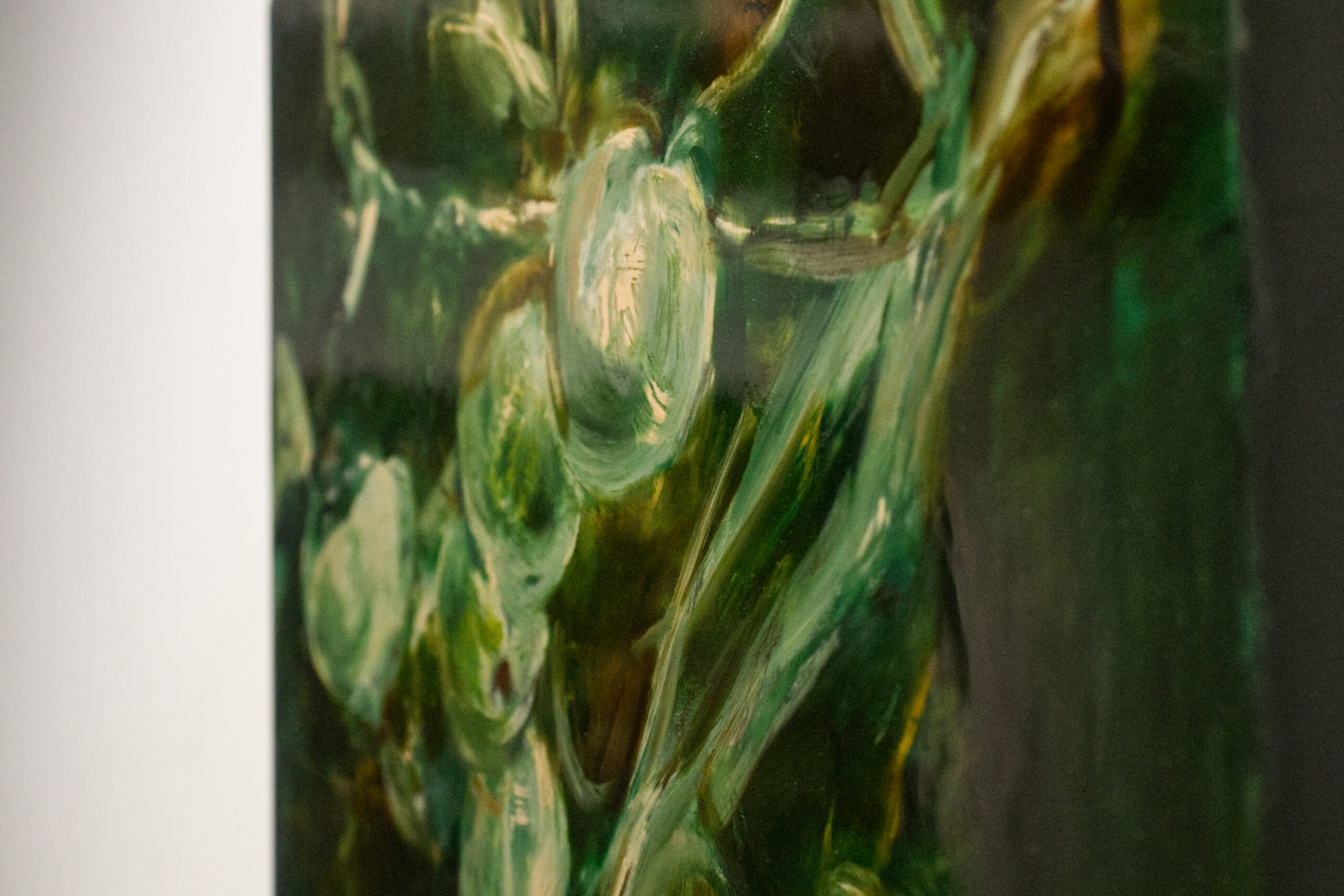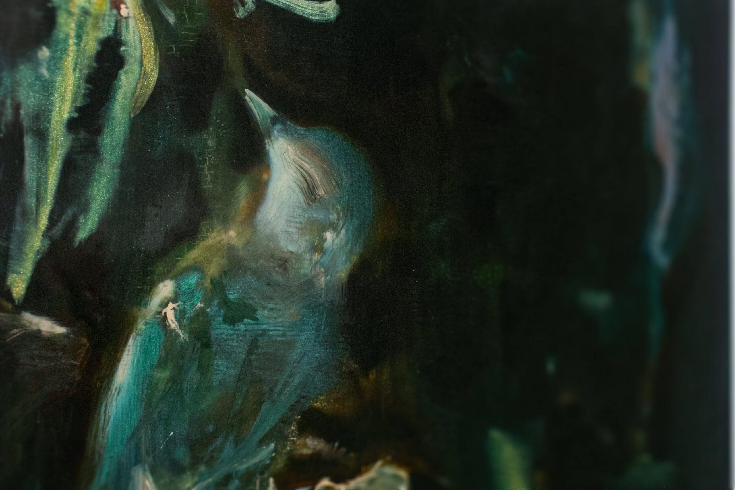 沖田愛有美の絵画は、自然と人間の境界を曖昧にしながら、幻想的な情景を立ち上げる独自の世界を描き出している。何層にも漆を塗り重ねた画面は、時に水面の揺らぎや森のざわめきを想起させ、観る者を現実と夢幻のあわいへと誘う。そこに描かれる人物や生きものは、自然の循環や神話的な物語と結びつき、人間の存在を大いなる環境の一部として示している。漆がもたらす光沢と深みをたたえたテクスチュアは、数年をかけて透明度が増し、内に秘められた層や色彩が徐々に浮かび上がってくるという。その変化は、ゆるやかに呼吸する自然の時間に寄り添うかのようであり、作品に独特の奥行きと生命感を与えている。