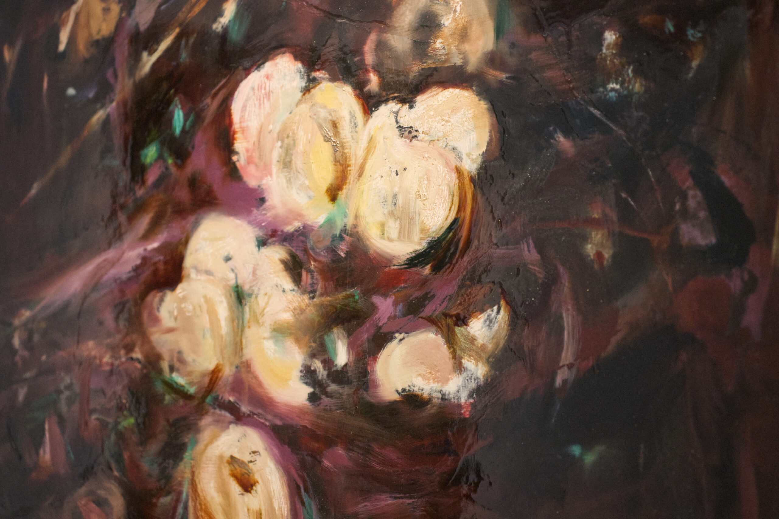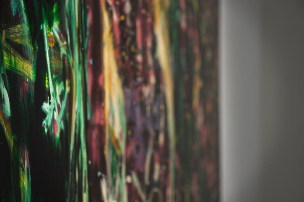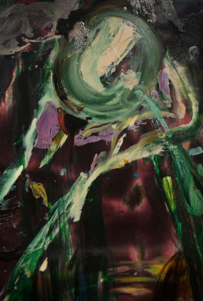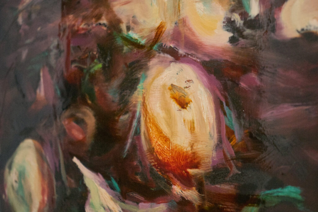 沖田愛有美の絵画は、自然と人間の境界を曖昧にしながら、幻想的な情景を立ち上げる独自の世界を描き出している。何層にも漆を塗り重ねた画面は、時に水面の揺らぎや森のざわめきを想起させ、観る者を現実と夢幻のあわいへと誘う。そこに描かれる人物や生きものは、自然の循環や神話的な物語と結びつき、人間の存在を大いなる環境の一部として示している。漆がもたらす光沢と深みをたたえたテクスチュアは、数年をかけて透明度が増し、内に秘められた層や色彩が徐々に浮かび上がってくるという。その変化は、ゆるやかに呼吸する自然の時間に寄り添うかのようであり、作品に独特の奥行きと生命感を与えている。