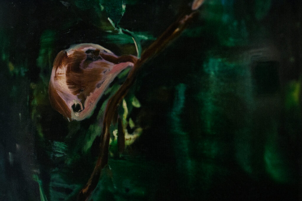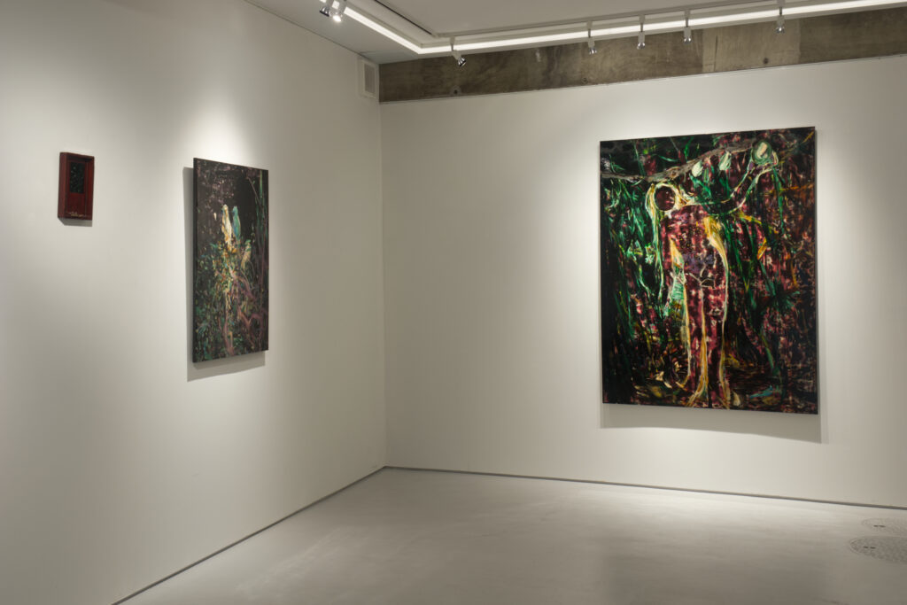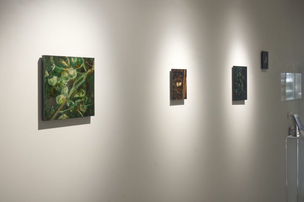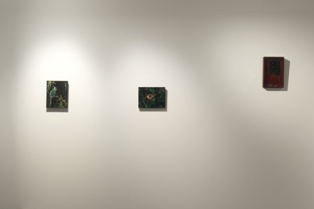 Ayumi Okita’s paintings unfold a distinctive world in which the boundary between nature and humanity grows porous, giving rise to dreamlike and atmospheric scenes. The multilayered surfaces—built through the repeated application of urushi lacquer—evoke the shimmer of water or the rustle of a forest, guiding viewers into the liminal space between reality and the imaginary. The figures and creatures that appear within these works are intertwined with natural cycles and mythological narratives, suggesting that human existence is but one part of a larger environmental continuum.